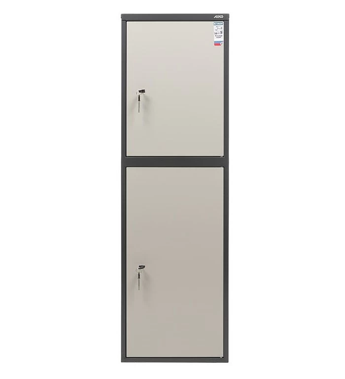 Шкаф Aiko SL-150/2Т – это прочное сварное изделие из стальных листов толщиной 1.2 мм. Состоит из двух секций, в нижней из которых имеются две полки, а в верхней – одна полка и кассовое отделение (трейзер) со своим замком. Полки можно передвигать по высоте с шагом 90 мм, позволяя распределить объём шкафа самым рациональным образом.