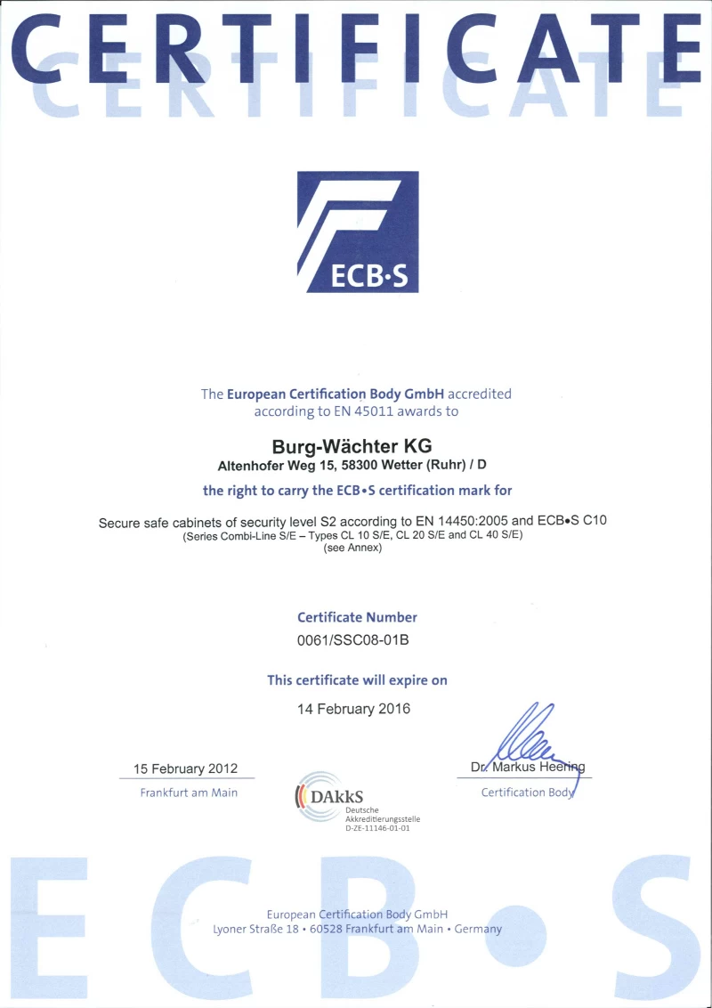 Огневзломостойкий сейф высокого качества, производимый в Германии, который обеспечит вам достойную защиту ценного имущества как от взлома, так и в случае пожара. Сейф Burg-Wachter CL 20 S сертифицирован по первому классу взломостойкости по европейским стандартам VdS и ECB-S; также он гарантирует 30 минут полноценной сохранности содержимого при возгорании (класс LFS 30P по стандарту EN 15659).